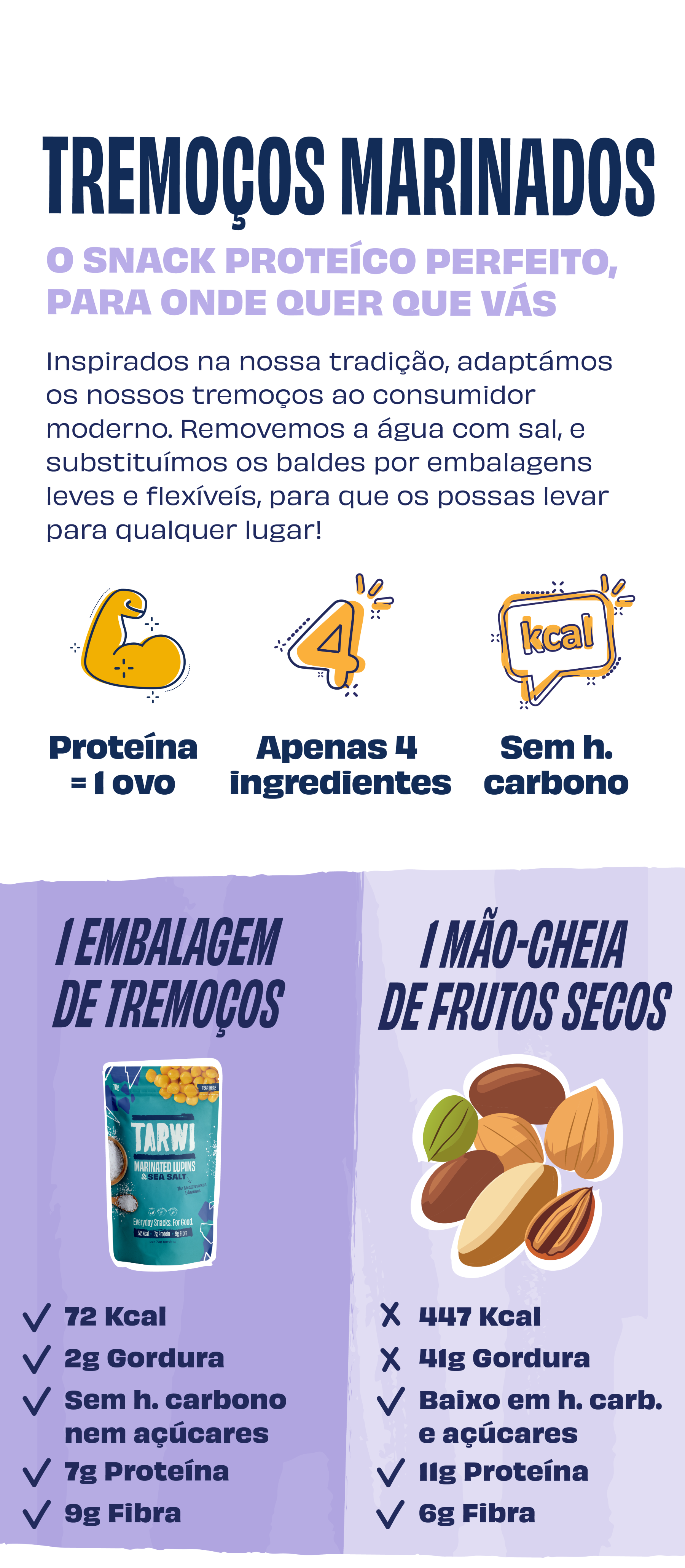 Sal Marinho: Tremoços cozidos (98%), sal marinho, regulador de acidez (ácido lático)